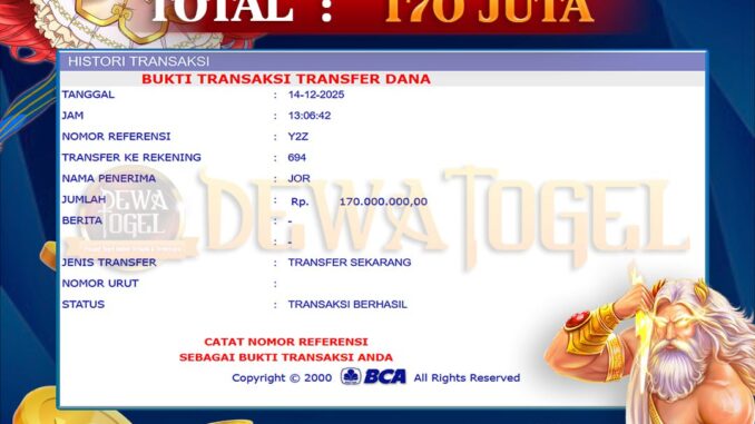 DEWATOGEL mengucapkan selamat kepada user id : YOG*** yang telah berhasil mendapatkan jackpot pada permainan SLOT DI GATES OF OLYMPUS 1000. Kemenangan sebesar Rp 170.000.000,-. telah dibayarkan LUNAS oleh pihak dewatogel kepada pemilik user id setelah yang bersangkutan mengisi formulir withdraw. Proses pencairan dana berlangsung sangat cepat hanya dalam waktu 5-10 menit sudah berada dalam rekening pemilik user id. Bukti transfer yang dapat anda lihat adalah bukti SAH / VALID yang langsung di dapatkan melalui bukti transaksi dari Bank yang digunakan untuk pengiriman dana pada rekening pemilik user id. Terima kasih kami sampaikan kepada para pengguna setia DEWATOGEL yang telah menggunakan situs kami, sebagai Bandar Terpercaya yang pastinya membayar semua kemenangan member hingga lunas. Apakah DEWATOGEL PENIPU ? Reputasi “DEWATOGEL TERPERCAYA” sudah sangat melekat. puluhan hingga ratusan ribu pengguna setia DEWATOGEL tetap menggunakan situs terbesar dan terbaik di Indonesia ini. Hapus rasa was-was dan khawatir anda, kemenangan anda berapapun PASTI dibayarkan hingga lunas.