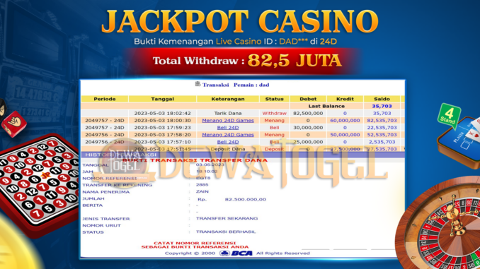 DEWATOGEL JACKPOT LIVE CASINO di 24D Rp 82.500.000 ,- LUNAS