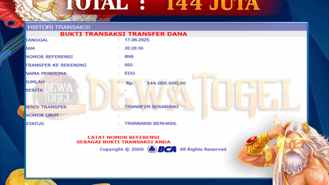 DEWATOGEL mengucapkan selamat kepada user id : NUS*** yang telah berhasil mendapatkan jackpot pada permainan SLOT DI JOKER JEWEL. Kemenangan sebesar Rp 144.000.000,-. telah dibayarkan LUNAS oleh pihak dewatogel kepada pemilik user id setelah yang bersangkutan mengisi formulir withdraw. Proses pencairan dana berlangsung sangat cepat hanya dalam waktu 5-10 menit sudah berada dalam rekening pemilik user id. Bukti transfer yang dapat anda lihat adalah bukti SAH / VALID yang langsung di dapatkan melalui bukti transaksi dari Bank yang digunakan untuk pengiriman dana pada rekening pemilik user id. Terima kasih kami sampaikan kepada para pengguna setia DEWATOGEL yang telah menggunakan situs kami, sebagai Bandar Terpercaya yang pastinya membayar semua kemenangan member hingga lunas. Apakah DEWATOGEL PENIPU ? Reputasi “DEWATOGEL TERPERCAYA” sudah sangat melekat. puluhan hingga ratusan ribu pengguna setia DEWATOGEL tetap menggunakan situs terbesar dan terbaik di Indonesia ini. Hapus rasa was-was dan khawatir anda, kemenangan anda berapapun PASTI dibayarkan hingga lunas.