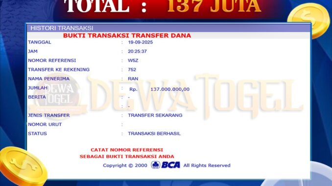 DEWATOGEL JACKPOT TOGEL DI JAKARTA 5D Rp 137.000.000,- LUNAS