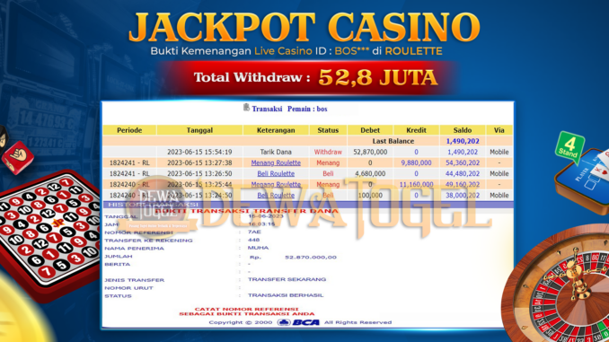 DEWATOGEL mengucapkan selamat kepada user id : BOS*** yang telah berhasil mendapatkan jackpot pada permainan LIVE CASINO di ROULETTE. Kemenangan sebesar Rp 52.870.000 ,-. telah dibayarkan LUNAS oleh pihak dewatogel kepada pemilik user id setelah yang bersangkutan mengisi formulir withdraw. Proses pencairan dana berlangsung sangat cepat hanya dalam waktu 5-10 menit sudah berada dalam rekening pemilik user id. Bukti transfer yang dapat anda lihat adalah bukti SAH / VALID yang langsung di dapatkan melalui bukti transaksi dari Bank yang digunakan untuk pengiriman dana pada rekening pemilik user id. Terima kasih kami sampaikan kepada para pengguna setia DEWATOGEL yang telah menggunakan situs kami, sebagai Bandar Terpercaya yang pastinya membayar semua kemenangan member hingga lunas. Apakah DEWATOGEL PENIPU ? Reputasi “DEWATOGEL TERPERCAYA” sudah sangat melekat. puluhan hingga ratusan ribu pengguna setia DEWATOGEL tetap menggunakan situs terbesar dan terbaik di Indonesia ini. Hapus rasa was-was dan khawatir anda, kemenangan anda berapapun PASTI dibayarkan hingga lunas.